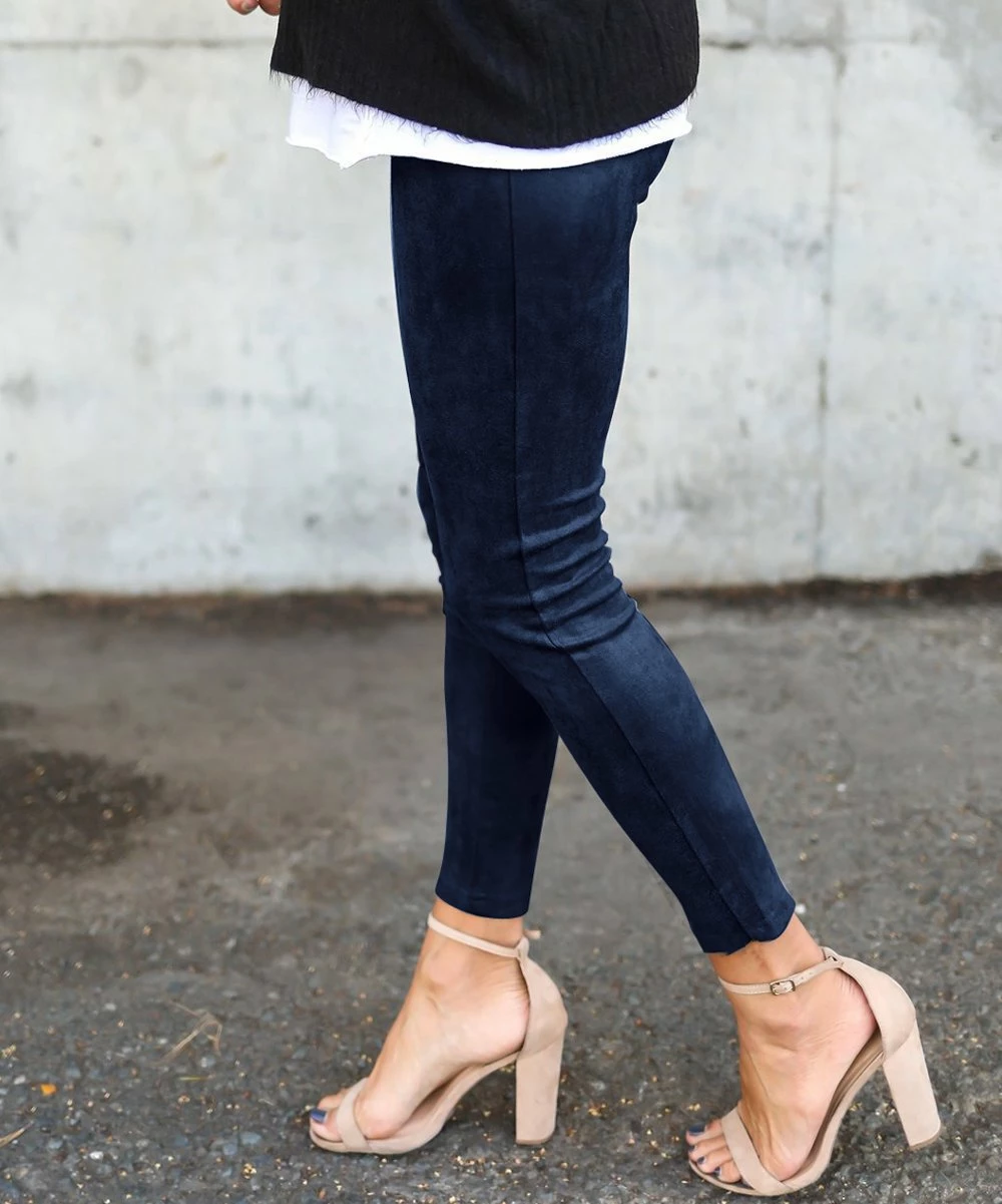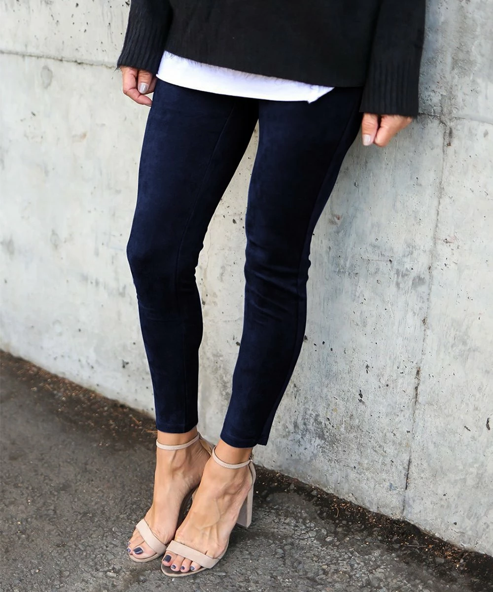 Feel comfortable without sacrificing your keen sense of style with this pair of stretch-infused leggings boasting a faux suede fabric and rich hue.