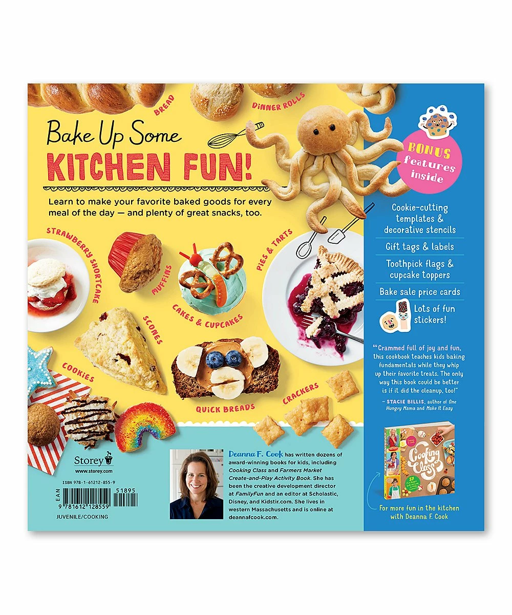 Following the best-selling book Cooking Class, this delightful baking cookbook for children ages 8β12 features 50 easy-to-follow, kid-friendly recipes. Lively step-by-step photos teach bakers-in-training how to knead dough, make biscuits, decorate cookies, and produce a perfect pie, along with essential skills like following directions and accurately measuring ingredients. Kids will learn to make both sweet and savory treats and will use fresh fruits and vegetables in recipes such as Bursting with Blueberries Muffins, Zombie Zucchini Bread, and Peachy Keen Crumble. Bonus goodie bag stickers, pop-out gift tags, and bake sale signs encourage kids to share their homemade delights with pride.